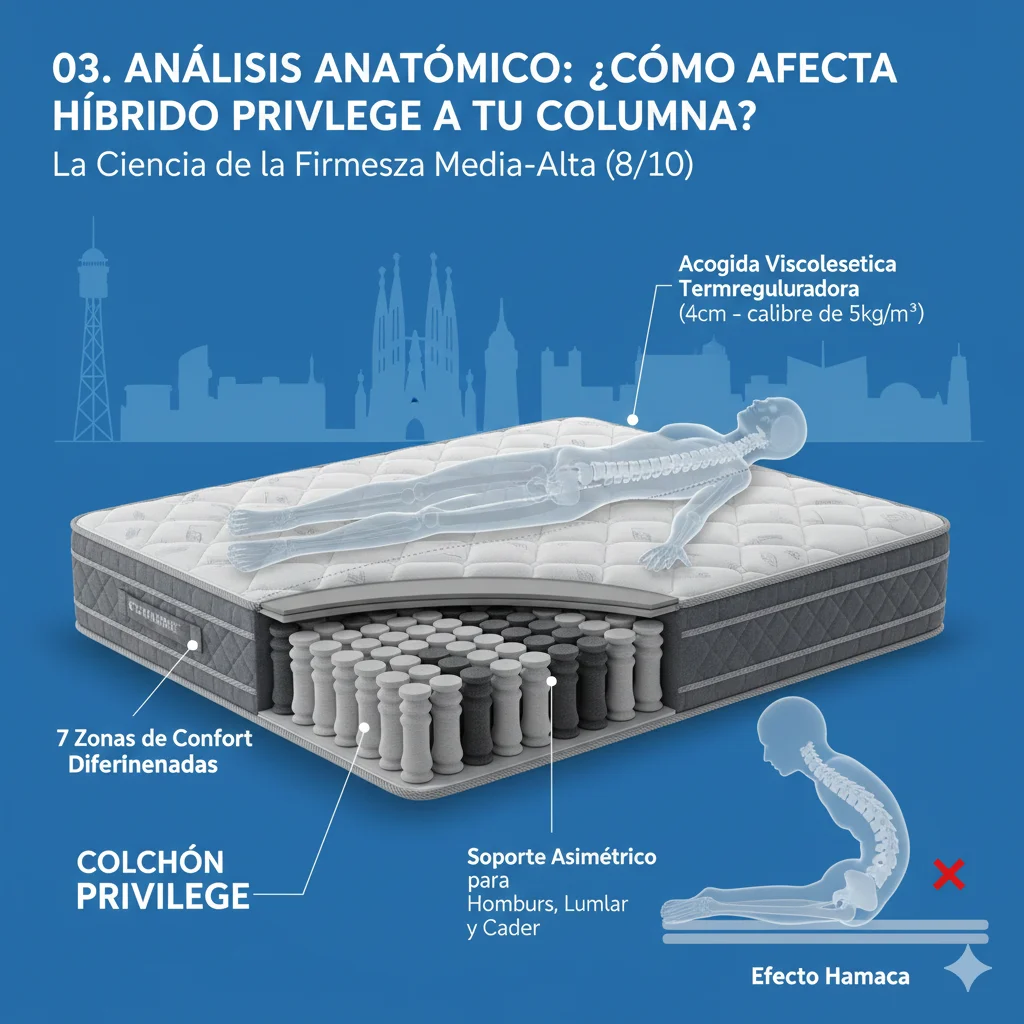El error más común al buscar el mejor colchón calidad precio en Barcelona es confundir la «suavidad» con el «confort». Desde una perspectiva de ingeniería biomecánica, el descanso reparador depende de la descompresión vertebral. El Híbrido Privilege utiliza un sistema de muelles ensacados con 7 zonas de confort diferenciadas, diseñadas para responder de forma asimétrica al peso de los hombros, la zona lumbar y la cadera.