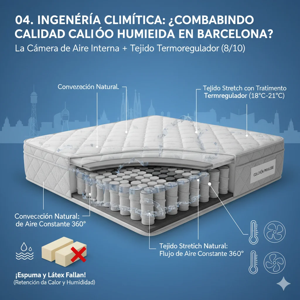 Vivir en Barcelona exige una característica no negociable: transpirabilidad. Con humedades relativas que superan el 70% en distritos costeros como el Poblenou o la Barceloneta, un colchón de espuma pura se convierte en un acumulador térmico. El núcleo del Privilege permite un flujo de aire constante de 360º, garantizando un descanso fresco incluso en las noches de agosto.